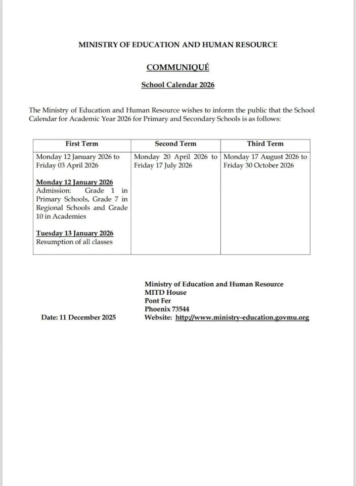 The Ministry of Education and Human Resources has released the official school calendar for the 2026 academic year for both primary and secondary schools.